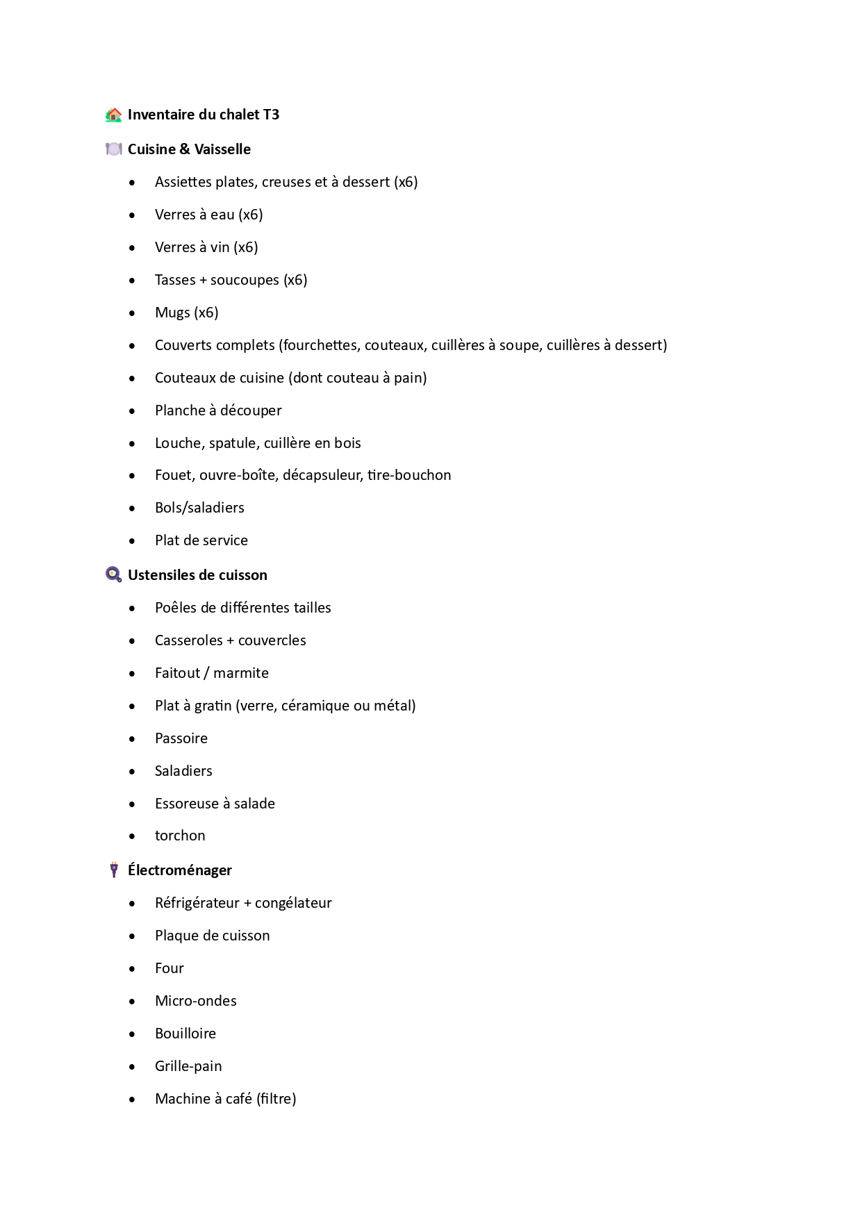 1 séjour avec 1 cuisine toute équipée (frigo/congélateur, plaque et four électrique, micro-onde, cafetière, grille-pain, bouilloire, couverts…) 1 salon avec canapé télévision et espace repas, climatisation
